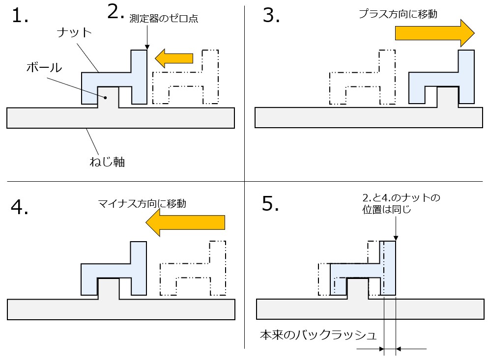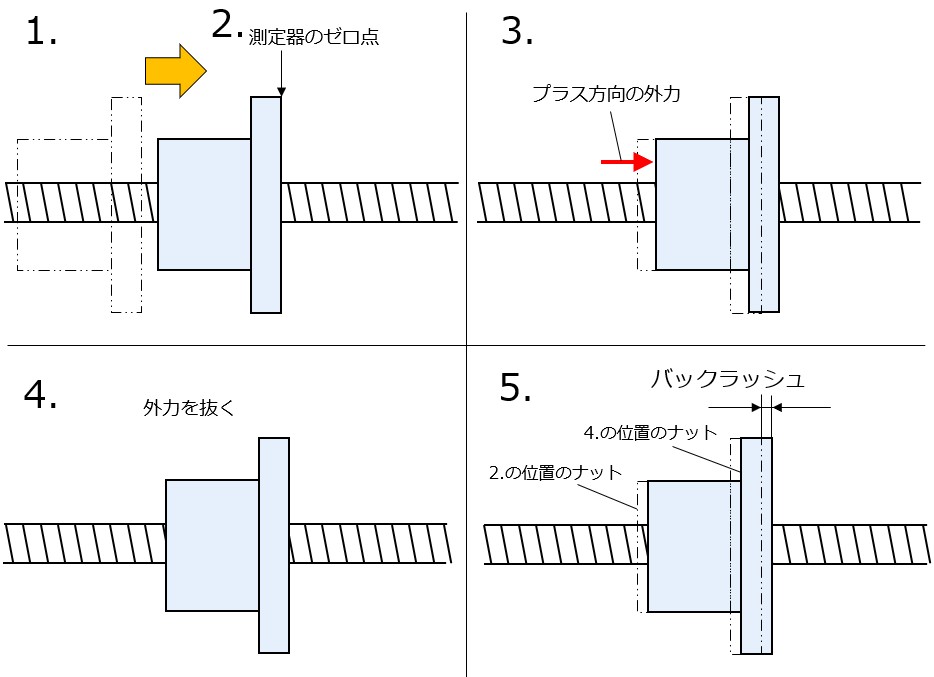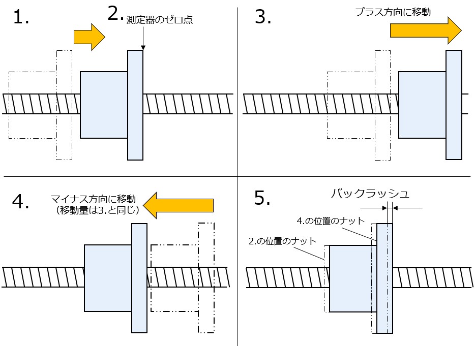この手順は2.と4.のナットの位置が同じになってしまい、バックラッシュの測定ができません。