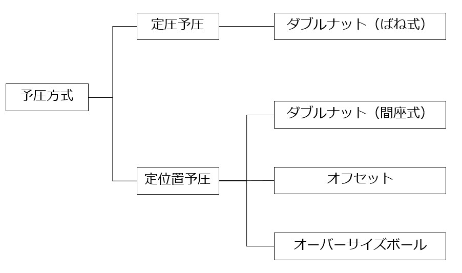 以下の図は予圧の分類を示したものです。予圧は一定の圧力をかける「定圧予圧」と一定の位置で予圧を管理する「定位置予圧」に二分されます。