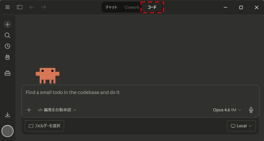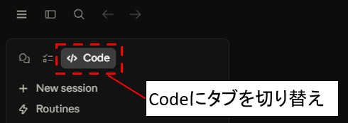Claude Codeのデスクトップアプリを立ち上げて、画面左上のタブを「Code」に切り替えます。