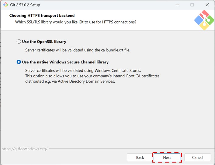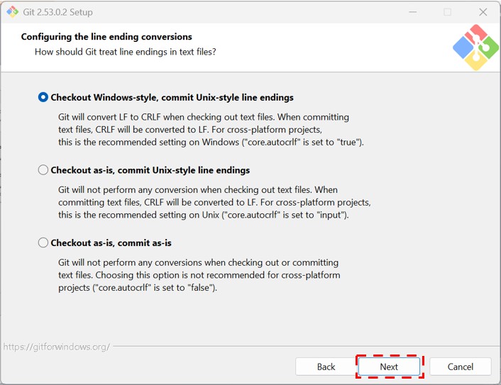 「Choosing HTTP transport backend」「Configuring the line ending conversions」はそのままでNextをクリックします。