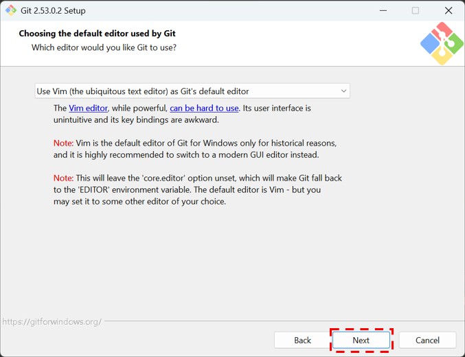Choosing the default editor used by Git(Gitのデフォルトエディタ)は、そのままでもOKです。筆者はそのまま(Use Vim)にしました。