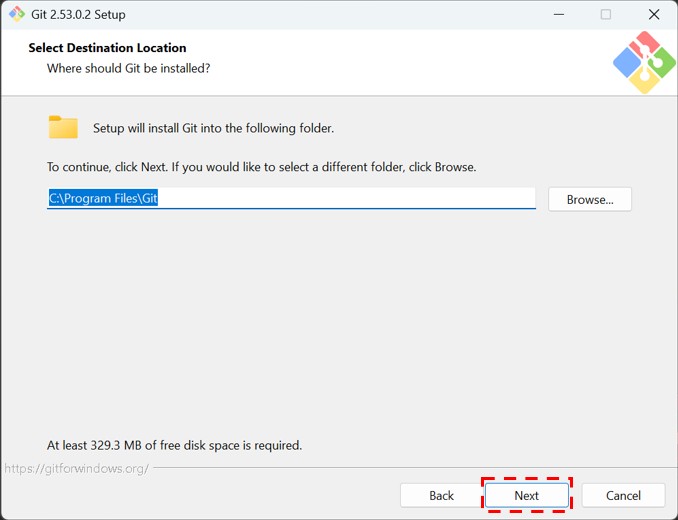 Gitのインストール場所を聞いてくるので、Nextをクリックします。特にこだわりがなければデフォルトの場所で問題ありません。