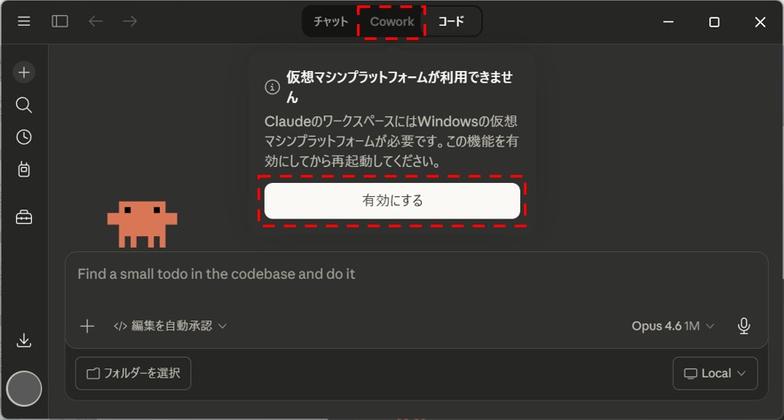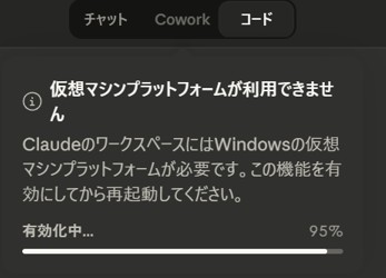 アプリ上部のタブを「Cowork」にすると、「仮想マシンプラットフォームが利用できません」と警告が出ます。