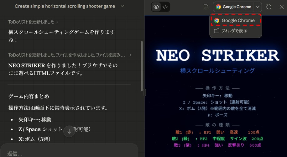 Claude Coworkが自動でプログラムを作ってくれました。ブラウザを立ち上げ、ゲームを起動します。