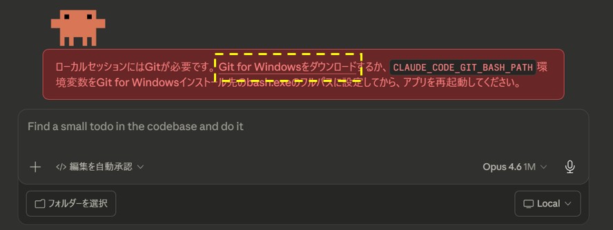 Claude Codeへの入力画面の上に、「ローカルセッションにはGitが必要です。」という警告が出るので、「Git for Windowsをダウンロード」のリンクをクリックしてGit for Windowsのダウンロードに進みます。