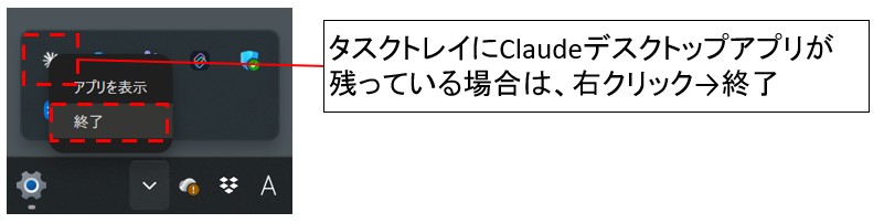 画面右下のタスクトレイから、Claudeアプリを終了させる