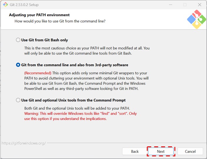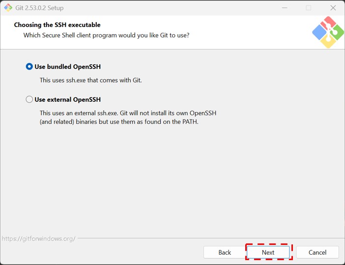 「Adjusting your PATH environment」「Choosing the SSH executable」はそのままでNextをクリックします。