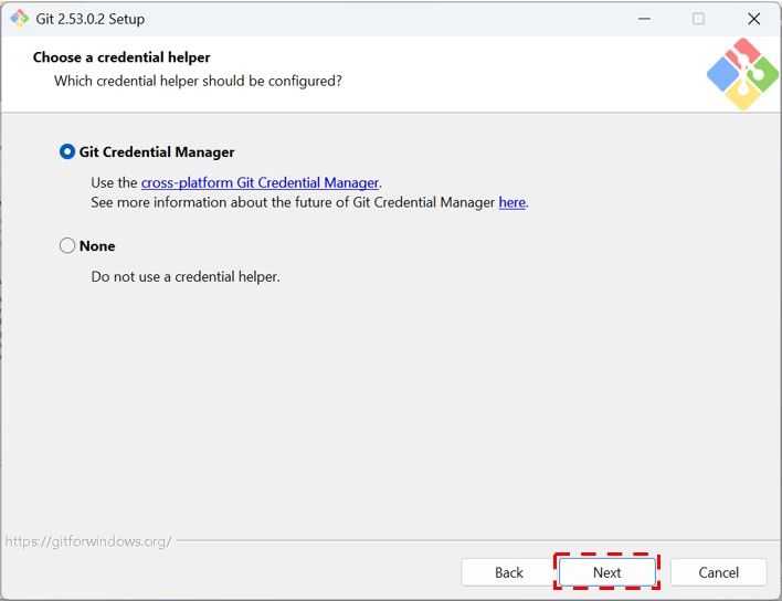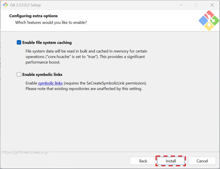 「Choose a credential helper」はそのままでNextをクリック、Configuring extra optionsは「Enable file system caching」を選択(デフォルトの選択肢です)し、Installをクリックします。