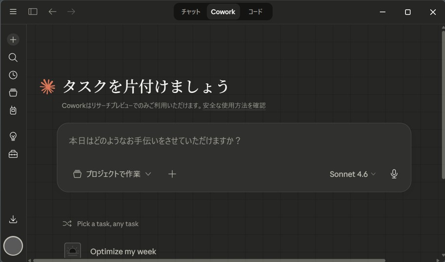 Claude Codeの導入手順は以上ですが、ClaudeデスクトップアプリにはClaude Coworkも使えるようになっています。せっかくなので、Claude Coworkも導入してみましょう。