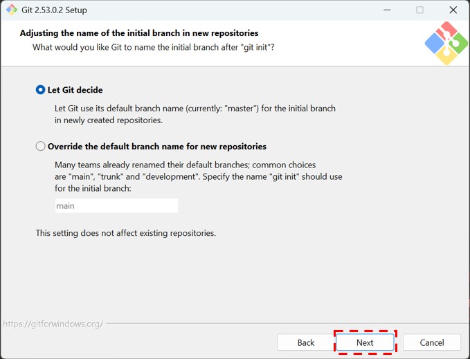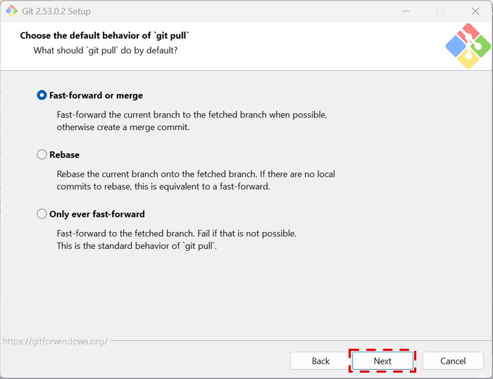 「Configuring the terminal emulator to use with Git Bash」「Choose the default behavior of `git pull`」はそのままでNextをクリックします。