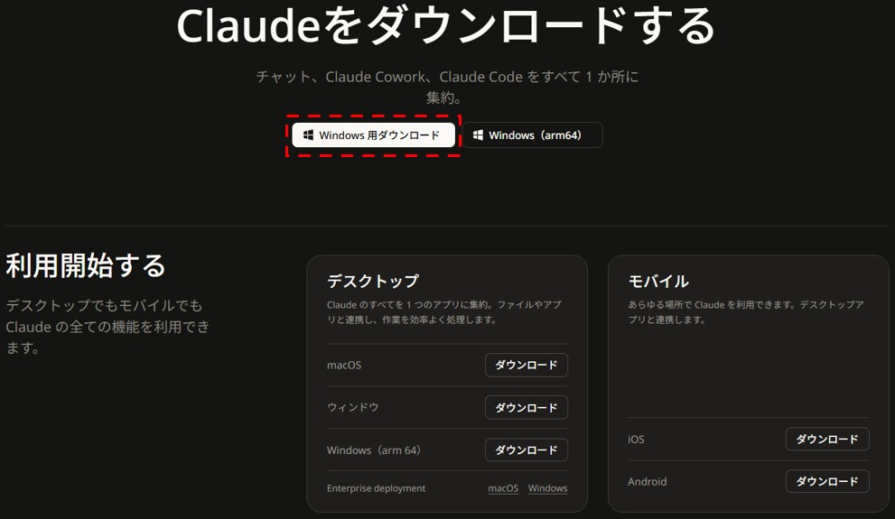 Claude公式サイトにアクセスし、「Windows用ダウンロード」から、インストーラ(Claude Setup.exe)をダウンロードします。