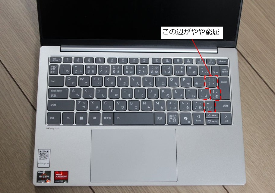 キーボードの右側の一部キーが小さく、右手の小指あたりが少し窮屈に感じます。