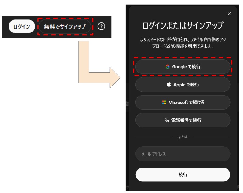 Googleアカウントがあれば、「サインアップ」の画面から「Googleで続行」をクリックしてログインもできます。