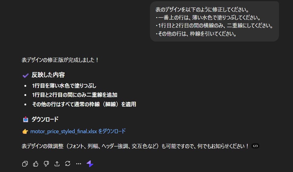 せっかくなので、表のデザインもChatGPTに修正してもらいましょう。