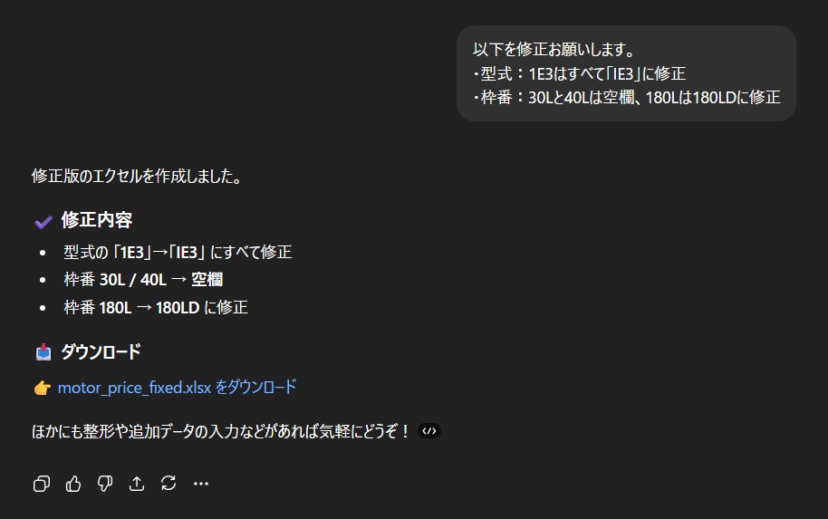 エクセルを直接修正してもOKですが、今回はせっかくなのでChatGPTに修正させてみました。