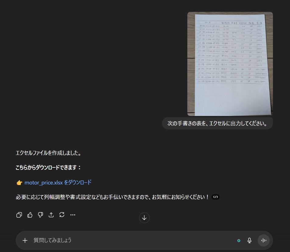 これだけで、ChatGPTが手書きの表をエクセルに変換してくれます。