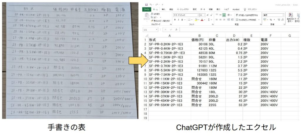 - ChatGPTに写真を添付し「次の手書きの表を、エクセルに出力してください。」と命令する