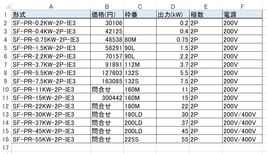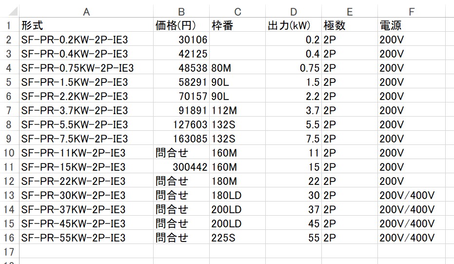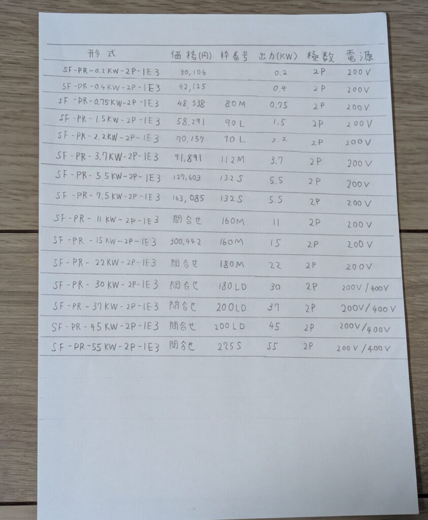 今回は、例として三菱電機製のモータ価格表を手書きで作成しました。