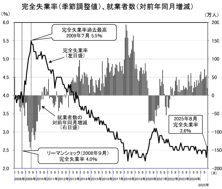 完全失業率は、リーマンショック後の2009年7月に過去最高の5.5%を記録した後、低下傾向にあり、2025年8月は2.6%となっています1。2020年はコロナショックで一時期3%を超えた時期もありましたが、すぐに低下しました。