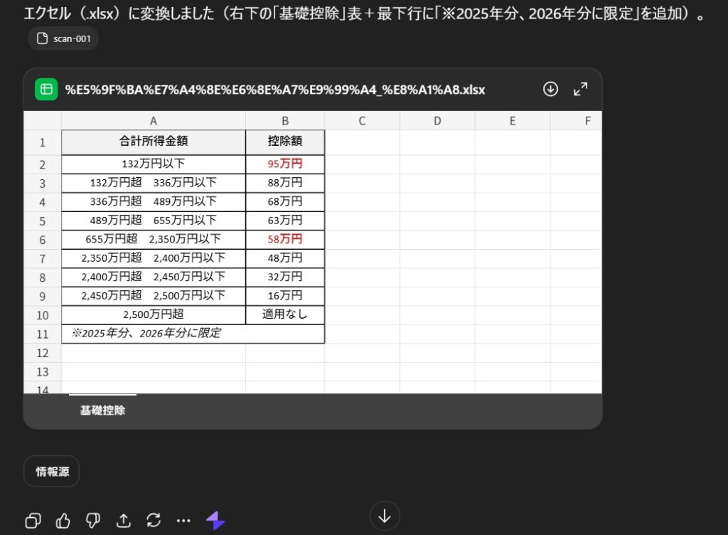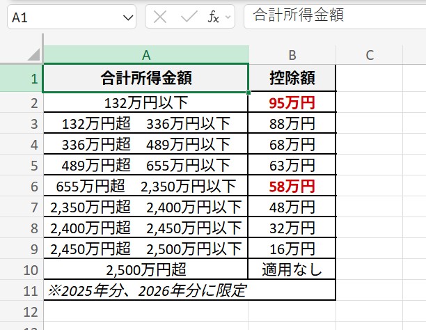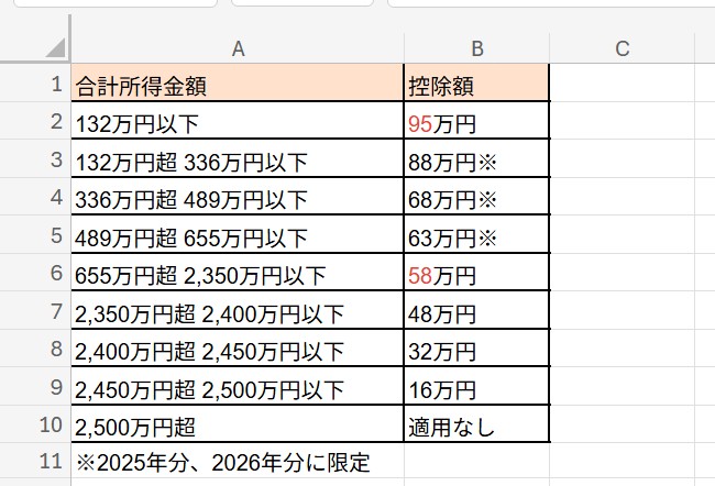 添付のPDFファイルの右下の「基礎控除」の合計所得金額と控除額の表をエクセル(.xlsx形式)に変換してください。行の一番下には「※2025年分、2026年分に限定」も追加してください。