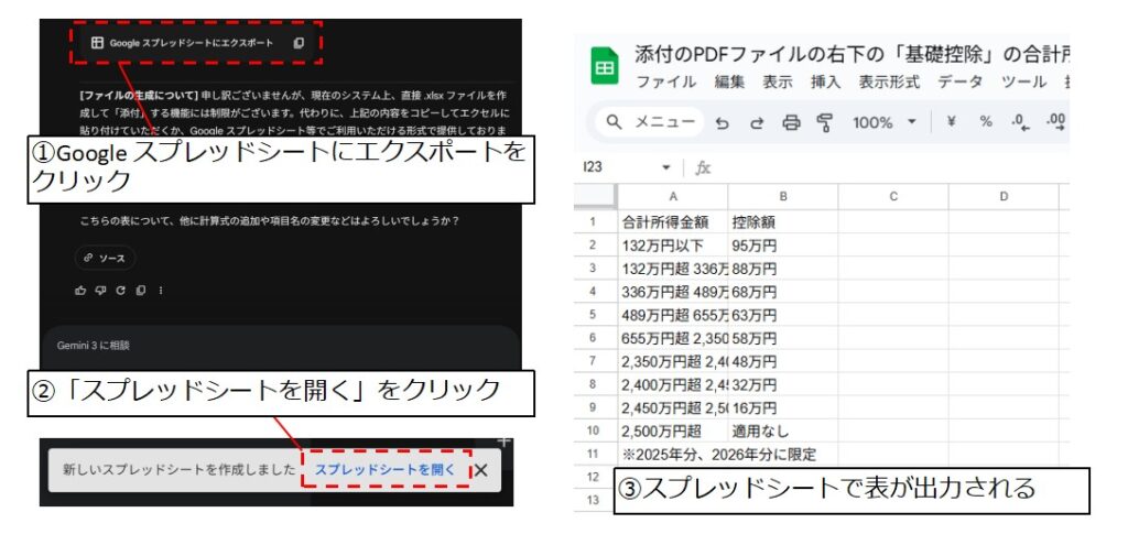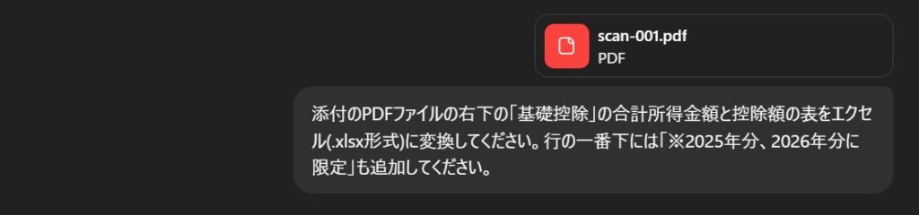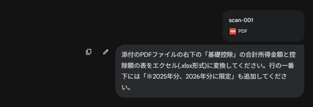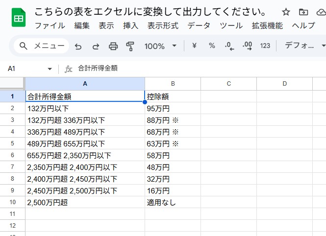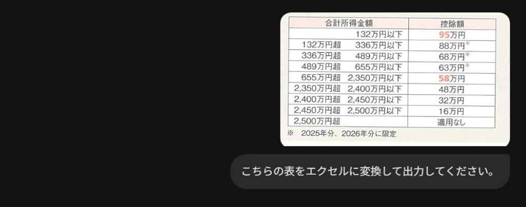 取り込みたい表(今回は、所得金額と控除額の表)をスクリーンショットで画像にして、以下のようにGeminiに命令しました。