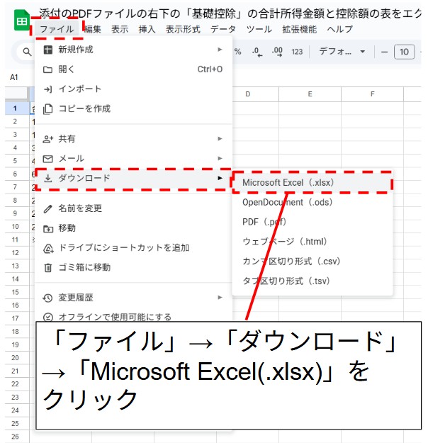 「ファイル」→「ダウンロード」→「Microsoft Excel(.xlsx)」で、スプレッドシートのファイルをエクセル形式でダウンロードします。