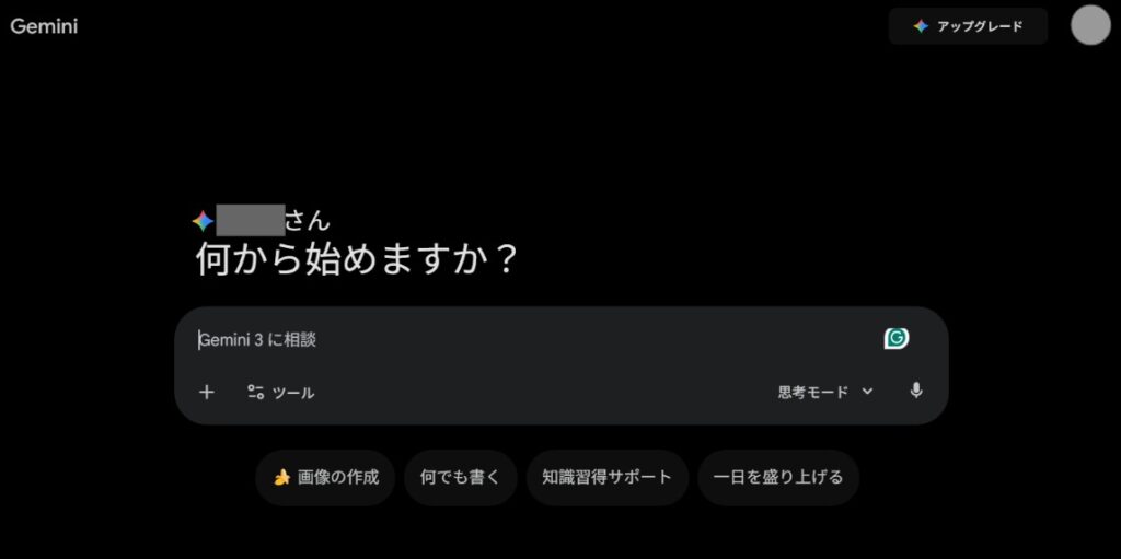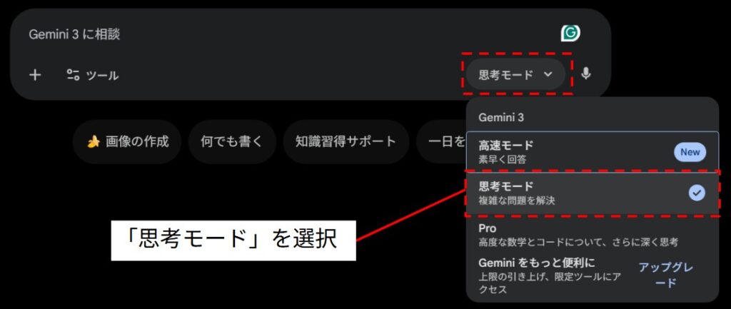 「Gemini 3 に相談」と書いてあるテキストボックスの右側で「思考モード」を選択しましょう。
