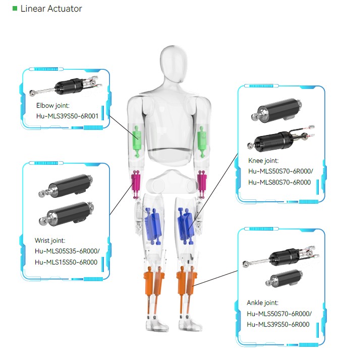 同社のHu-MLSシリーズのカタログには、リニアアクチュエータの使用部位が示されています(下図)。型番に応じて手首関節から膝関節まで使えるラインナップがあります。