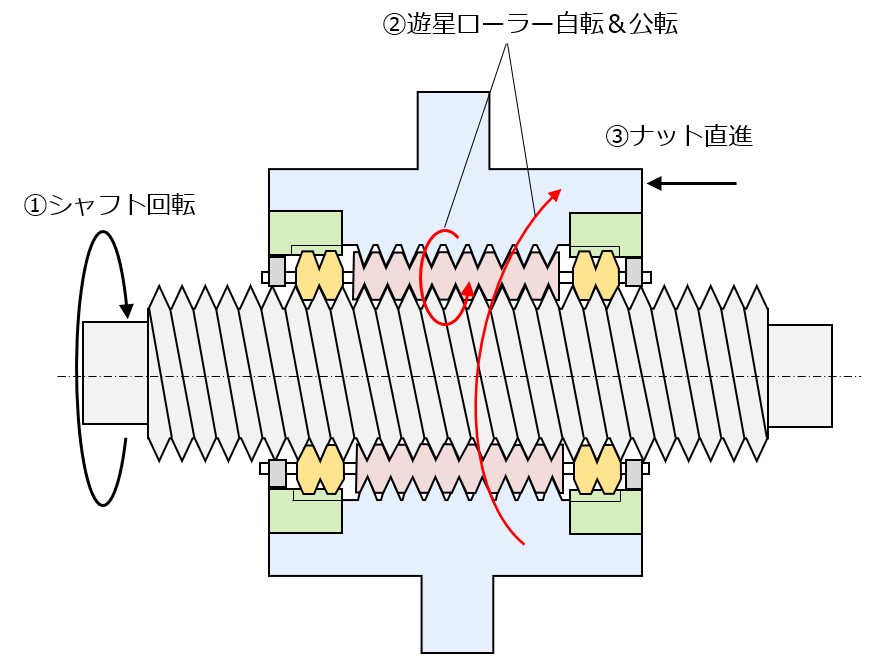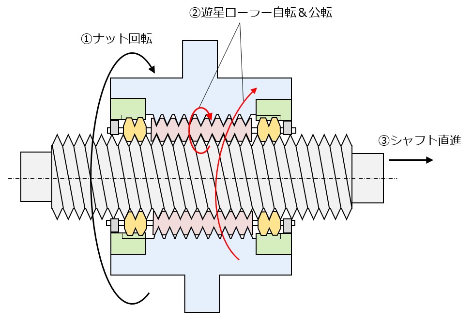- 遊星ローラーがナット、シャフトとかみ合い、自転と公転をする