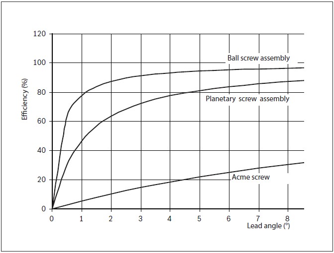 また、効率面ではボールねじの方が有利です。下の図は遊星ローラーねじとボールねじの効率を表したものです。ざっくりですが、遊星ローラーねじの効率は80%程度、ボールねじの効率は90%程度となっています。