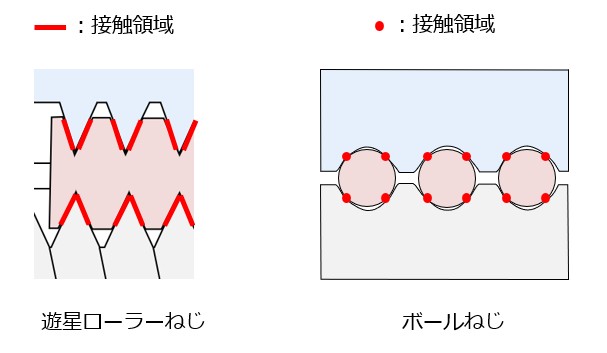 下の図が遊星ローラーねじとボールねじの接触領域の違いを示したものです。遊星ローラーねじの方が接触領域が広く、そのぶんより大きな力を伝えることができます。