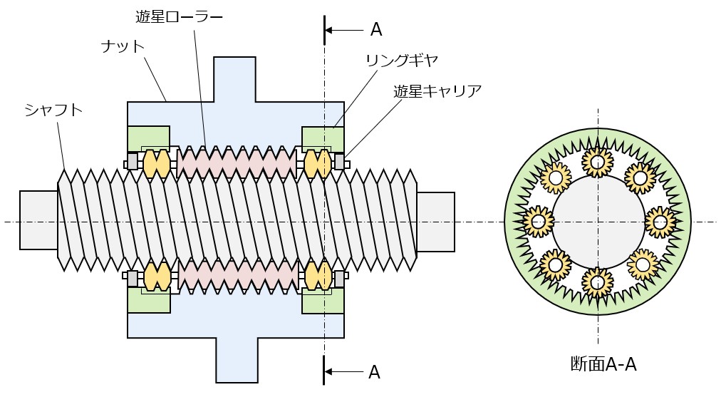 - ナット:遊星ローラーにかみ合う部品。ボールねじのナットと同じ役割を持つ